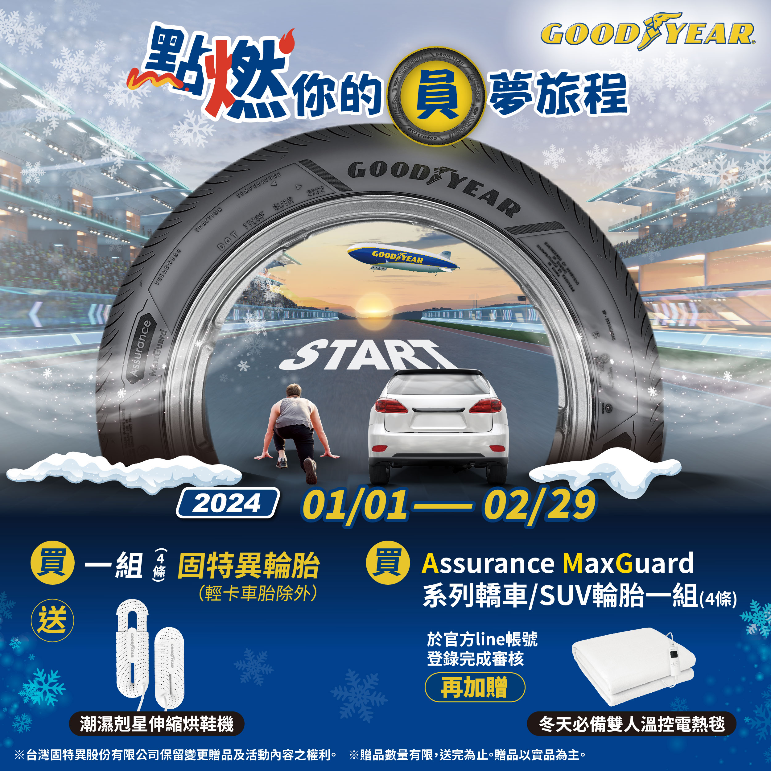 於2024/1/1-2/29購買一組(4條)固特異轎車胎、休旅車胎(不含輕卡車胎),即可獲得一個潮濕剋星伸縮烘鞋機,在濕冷的冬季,讓你的鞋襪保持溫暖清爽,穿上以後舒適自在。凡購買一組(4條)AMG系列輪胎,完成LINE登錄審核再加贈冬天必備的雙人溫控電熱毯一個,讓你與摯愛一同享受溫暖。 了解更多