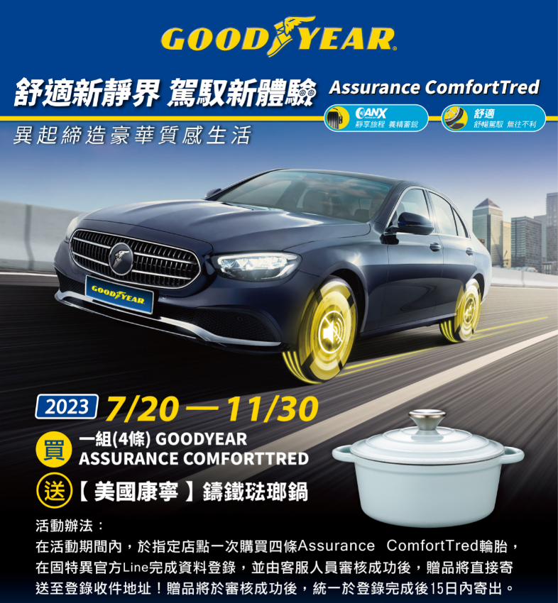 2023年7/20至11/30止,凡於指定店點一次購買四輪Assurance ComfortTred (ACT),於台灣固特異官方Line完成登錄及照片上傳,經審核通過後可獲贈美國康寧20cm琺瑯鑄鐵鍋一只! 了解更多