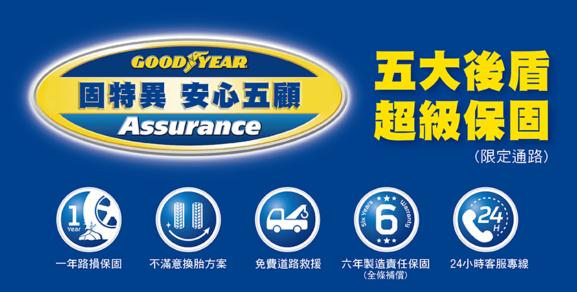 路損保固、滿意保證、道路救援、產品品質保固、客服專線─五大後盾 超級保固