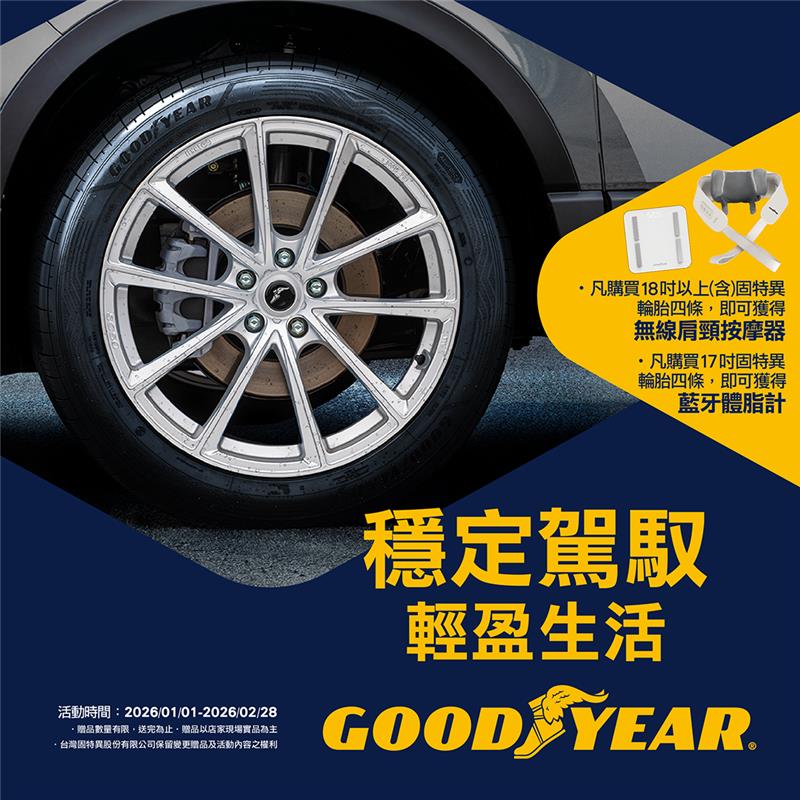 活動期間2026/01/01 -2026/2/28,凡購買18吋以上(含)固特異輪胎四條,即可獲得無線肩頸按摩器一個;凡購買17吋固特異輪胎四條,即可獲得藍牙體脂計一個,數量有限,送完為止! 了解更多
