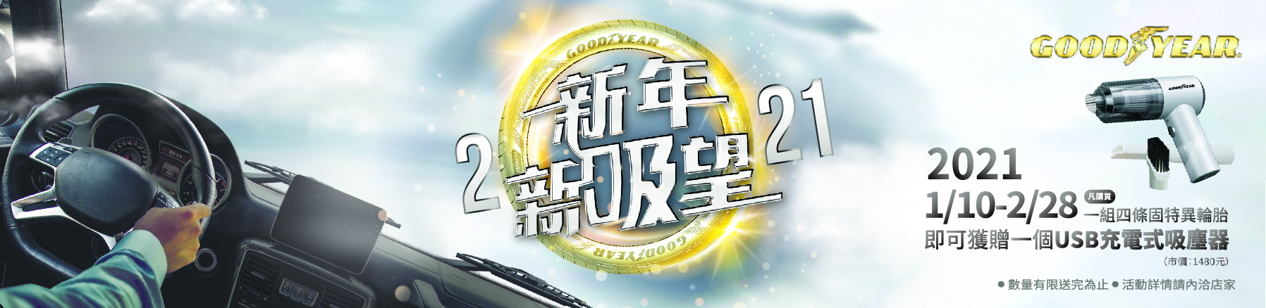 於活動期間(2021/1/10至2/28)內,購買四條固特異轎車胎或休旅車胎(不含小貨車胎),即可獲得USB充電式吸塵器。數量有限,送完為止。
