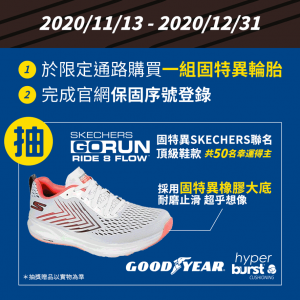 今年年末,固特異特別推出限時抽獎贈送固特異Skechers聯名頂級鞋款,除了駕駛時使用固特異輪胎可以安心,外出穿著固特異Skechers聯名鞋也放心。