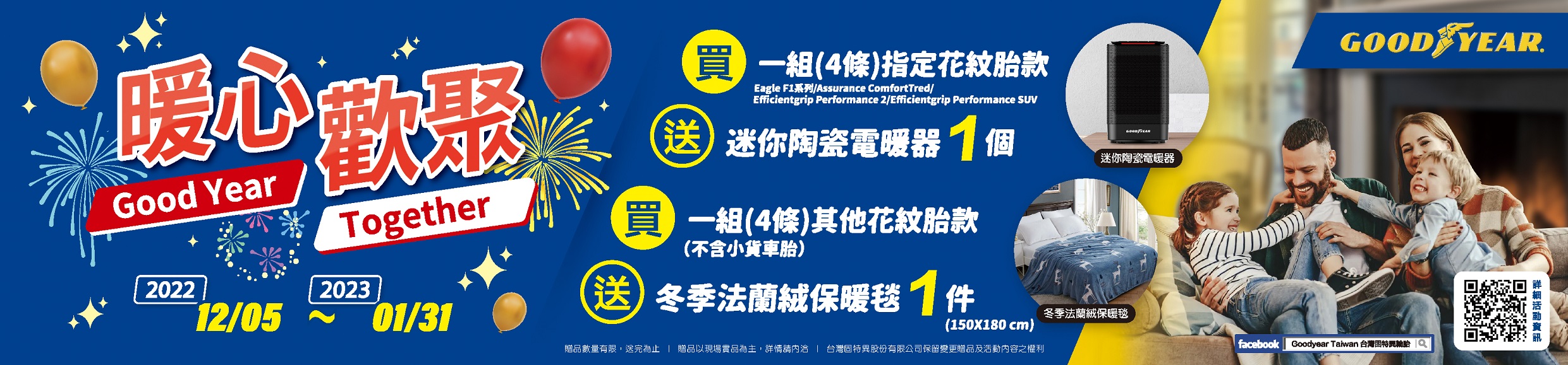 自2022年12月5日至2023年1月31日止,購買一組(四條)固特異指定花紋輪胎,即可獲得迷你陶瓷電暖器。購買一組(四條)其他固特異花紋輪胎(不含小貨車胎),可獲贈一條冬季法蘭絨保暖毯。無論買哪款固特異輪胎,讓固特異陪您暖心歡聚,期待Good year together!