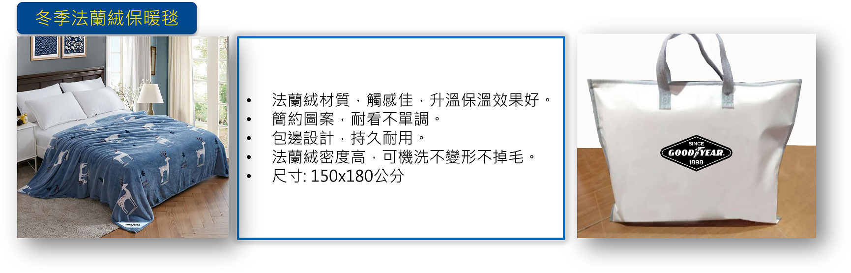 - 凡購買一組(四條)固特異其它花紋輪胎(不含小貨車胎),送冬季法蘭絨保暖毯一條。