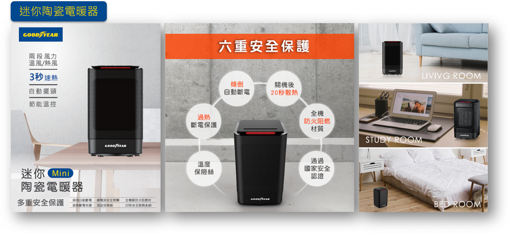 - 凡購買一組(四條)固特異指定花紋輪胎 (Assurance ComfortTred, Eagle F1全系列, Efficientgrip Performance 2, Efficientgrip Performance SUV),送迷你陶瓷電暖器一只。